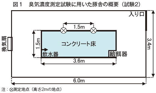 アンモニアの測定は留置式アンモニア検知管(アンモニアパッシブドジチューブ、ガステック、神奈川)により、図1に示した一定の2地点で22:00から翌8:00までの10時間、毎日実施し、得られた2地点のデータの平均値を単位時間あたりに換算したものを平均濃度とした。