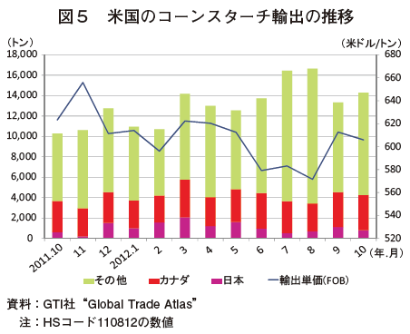10月のコーンスターチ輸出量は、前年同月比38.8%増の1万4300トンであった。2012年1〜10月の輸出量については、13万5800トンと前年同期比27.2%増となった。1〜10月における国別輸出量は、カナダ向け3万1400トン(前年同期比16.5%増)、メキシコ向け3万1100トン(前年同期の3.1倍)、英国向け1万3400トン(前年同期比7.8%増)、日本向け1万1600トン(同39.9%増)となった。