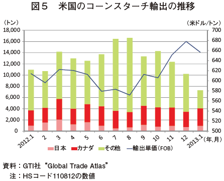 2013年1月のコーンスターチ輸出量は、前年同月比33.6%減の7300トンであった。1月における国別輸出量は、カナダ向け3100トン(前年比15.0%増)、日本向け960トン(同4.7%減)、英国向け820トン(前年比23.3%減)であった。