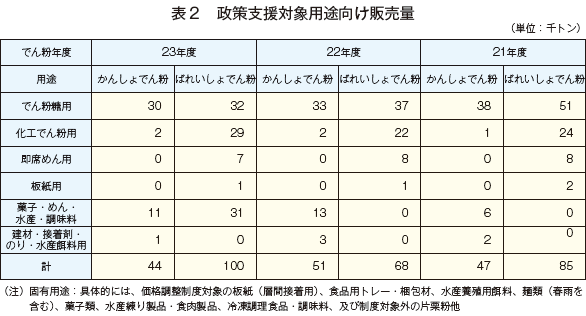 イ.政策支援対象用途向け販売量は、前年より大きく増加しているが、これは平成23年10月から、従来の政策支援対象用途に菓子、即席めん以外のめん類、水産練製品、冷凍調理食品、食肉製品、調味料が加わり、支援対象が拡大したことによる。