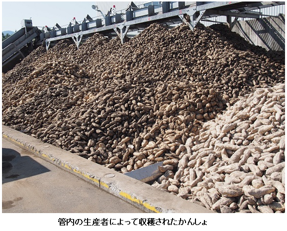 同工場の中村工場長によると、「今年産は、干ばつによる被害に加え、害虫被害も一部のほ場で見受けられており、葉を食害され光合成が十分に出来なかったかんしょのでん粉含有量の少なさが危惧されている。11月以降に搬入されるのは、5月以降に植え付けされたかんしょも含まれてくるため、収量性が懸念される。収穫終了までの天候により収量およびでん粉含有量が回復するよう期待している。」とのことである。