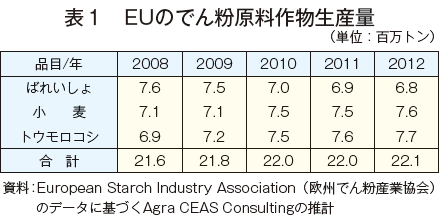 EUのでん粉生産は、主にばれいしょ、小麦およびトウモロコシを原料としている。ばれいしょでん粉の生産量は、世界全体のばれいしょでん粉生産の約3/4を占め、2012年に日本が輸入したばれいしょでん粉(1万4400トン)の99.9%以上がEU産であった。また、EUの化工でん粉は、世界全体の化工でん粉生産量の約1/4を占め、2012年に日本が輸入した化工でん粉(でん粉誘導体およびデキストリン:7万1400トン)の1割強がEU産であった。このように、EU産でん粉は、でん粉の国際需給に大きな影響を及ぼし、日本との関係も深い状況にある。