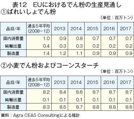 しかし、2012年にばれいしょでん粉製造事業者への支援(プレミアム)が打ち切られたことにより、ばれいしょでん粉およびでん粉用ばれいしょの生産は不安定な状況となりつつある。2012年以降、でん粉用ばれいしょ生産者に対し、直接支払制度が再導入されたことで、でん粉用ばれいしょ生産者の生産意欲は、持続すると考えられるが、一方、プレミアムなどのでん粉製造事業者への支援は廃止されたことから、ばれいしょでん粉の価格競争力は、今後、弱まっていく傾向にあるとみられている。中長期的には、ばれいしょでん粉の需要の一部が、小麦でん粉やコーンスターチにある程度移行すると推察される。新加盟国では、小麦でん粉やコーンスターチ製造に対する投資が進むことなどにより、小麦でん粉およびコーンスターチ、小麦およびトウモロコシの増産も見込まれている。