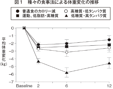 図1は種々の食事法の体重への影響を調べたものである(Gardner,C.D. et al. JAMA 297;969,2007)。これによるとアトキンス法と言われる高タンパク質、低糖質の食事が最も体重を減らし、高糖質の食事は体重を減らさない。