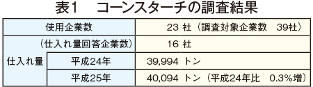 調査対象企業の平成25年の仕入れ量の合計は、コーンスターチ、タピオカでん粉、小麦でん粉は前年を上回り、化工でん粉は前年を下回った。仕入れ価格はいずれも年間を通しておおむね安定していた。また、使用しているでん粉の種類を切り替えることは、ほとんどの企業で行われておらず、その最大の理由は、それぞれの製品特性に合うでん粉を選択し、製造しているからであった。