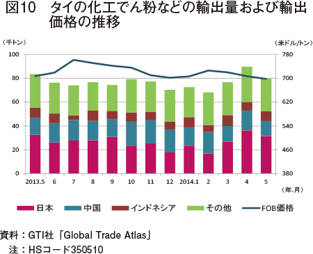 タイタピオカでん粉協会(TTSA)によると、2014年7月第2週のタピオカでん粉の国内価格は、1キログラム当たり13.0バーツ(41.6円、前年同月比12.2%安)、輸出価格(FOB・バンコク)は、1トン当たり420米ドル(4万2840円、同17.6%安)とそれぞれ前月に比べ下落した(図6)。