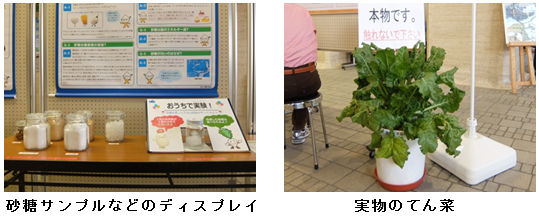 会場には、価格調整制度、砂糖およびでん粉の製造工程、種類や用途などに関するパネルを展示し、これに関連したパンフレットを配布するとともに、鉢に植えた実物のてん菜なども展示した。