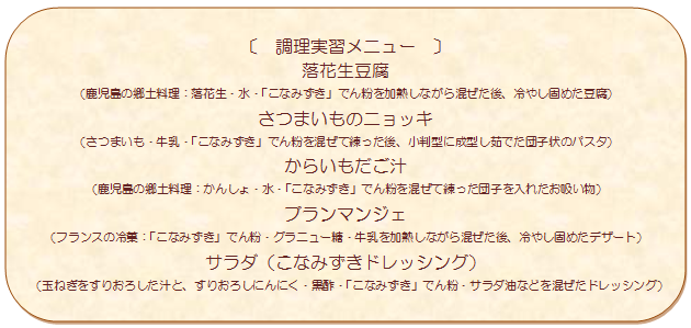 続いて、時村参事付の指導の下、実際に「こなみずき」でん粉を使った調理実習が行われた。学生方はでん粉がだまになったり焦げ付いたりしないよう注意しながら、手際よく調理していた。今回調理したメニューは以下の通り。