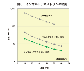図2)。水溶液の粘度はアラビアガムのような増粘多糖類に比べて顕著に低く、マルトデキストリン(DE8)に比べても低い(