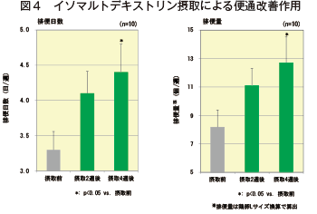 第2に、便通に与える影響について、イソマルトデキストリンの摂取が便秘傾向のヒトにおいて、便通を改善させる作用を有することが確認されている。1週間の排便回数が2〜4回の成人女性10名にイソマルトデキストリンを4週間、毎食時10グラム摂取させたところ、排便日数および排便量は摂取前と比較して有意に増加し、腸内のビフィズス菌占有率は対照群(マルトデキストリン摂取群)と比較して有意に増加した(