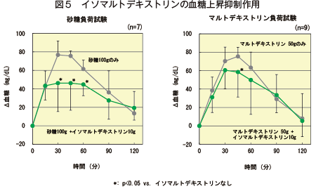 最後に、血糖に与える影響について、イソマルトデキストリンを砂糖やマルトデキストリンなどの糖質と同時摂取した場合、摂取後の血糖上昇を抑制することが確認されている。砂糖(100グラム)もしくはマルトデキストリン(50グラム)のみを摂取させたときに血糖値が上がりやすかったヒトを対象にイソマルトデキストリン(10グラム)を添加した砂糖(100グラム)もしくはマルトデキストリン(50グラム)を摂取させたところ、イソマルトデキストリンなしのときに比べて血糖値の上昇が抑制された(
