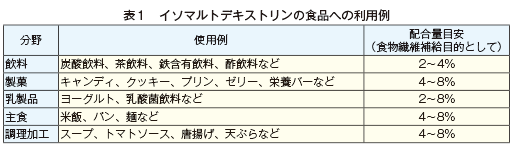 イソマルトデキストリンは独自の製法により、色がない、においがない、甘味がほとんどない、といった特徴を有しており、また水溶性も高いことから、飲料、製菓、乳製品、主食、調理加工品などのあらゆる食品に配合可能である。色がない(白い)ことを利用すれば、米飯やヨーグルトなど、もともと色が白い食品への配合時にメリットがでてくる。また、においがない、甘味がほとんどないことを利用すれば、緑茶や紅茶などの風味を大切にする飲料への配合時にメリットがでてくる(