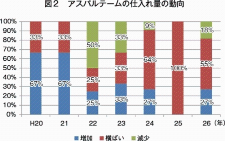 食品化学新聞社「食品添加物総覧2011−2014」によると、わが国におけるアスパルテームの年間の需要量は約480トンで、分野別の内訳は飲料50%、ガム・タブレットなど35%、チルド商品・その他15%となっている。わが国では、大手食品メーカーが製造する国産品と輸入品が流通しており、財務省「貿易統計」によると、平成27年の輸入量は155トン(前年比10.2%減)であった(