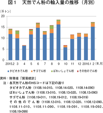 財務省「貿易統計」によると、2016年2月の天然でん粉の輸入量は、1万7341トン(前年同月比21.5%増、前月比43.3%増)と、前月から大幅に増加した(図1)。