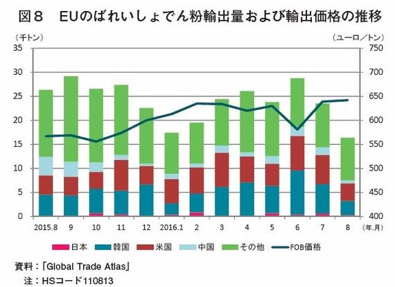 コラム EU・カナダ包括的経済貿易協定欧州委員会のユンカー委員長、欧州理事会のトゥスク議長、カナダのトルドー首相らは10月30日、EU・カナダ包括的経済貿易協定(CETA:Comprehensive Economic and Trade Agreement)署名を発表した。同協定は、2009年に交渉が開始され、2014年に大筋で合意されたものであり、2017年早期の発効を目指している。これを受けて、本稿では、両国(地域)間のでん粉の貿易動向や同協定の内容について紹介する。1. カナダのEUからの輸入 まず、カナダがEUから輸入するでん粉に対する輸入関税は、ばれいしょでん粉を除き即時撤廃される(表1)。カナダにとって、EUは最大のばれいしょでん粉輸入先であり、国内への影響を一定程度考慮したとみられる(表2)。一方、その他のでん粉については、米国、タイ、中国からの輸入が大半を占めており、影響は限定的とみられることが、即時撤廃の背景にあると考えられる。 |
