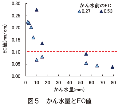 そのためには、簡易測定法によるEC値をかん水後0.1程度まで低減させる必要がある(図4)。また、塩分の葉への付着が収量の低下を招いた年もあり、このような場合は、かん水によって収量の低下を軽減することが可能となる。