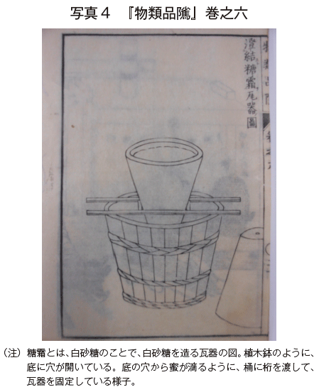『物類品隲』巻之六の「甘_蔗培_養并ニ製_造ノ法」には、さとうきびの栽培法から、圧搾機の作り方(写真3)、煮詰め工程、白砂糖製法、氷砂糖製法などが、中国の書物からの引用と日本での概説を加えながら、記述されている。前々号で紹介した長府藩領や前号で紹介した尾張知多半島で作られていたことも記されている。