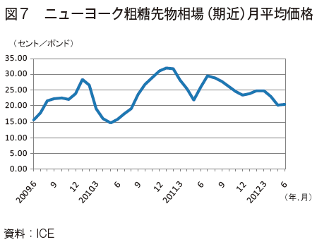 7月に入ってからも相場(期近10月限)は上昇傾向で推移し、20日には2012年4月以来の高値水準となる1ポンド当たり23.92セントに達した。相場上昇の背景には、前月に引き続きブラジルの生産が不安視されたほか、世界最大の生産国インドでモンスーン期の降水量が平年を下回り、2012/13年度のさとうきび生産に悪影響を与えるとの懸念が広がったことがある。また、世界第3位の輸出国豪州で、降雨により砂糖生産に遅れが生じていることも影響したとみられる。