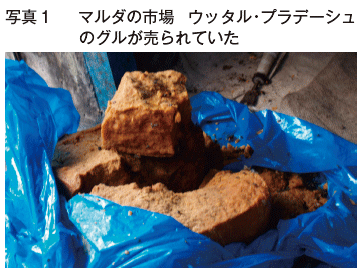 バングラデシュとの国境に位置するインドの西ベンガル州マルダ県では、グルのことをチャッキーと呼んでいる。市場には、固形のグルが売られているが、その多くが、インド最大の砂糖生産地である、ウッタル・プラデーシュ州から運ばれてきたものだった(写真1)。大量に仕入れて市場に卸す中間業者の家には、ビニールで包装されたグルが積まれていた(写真2)。