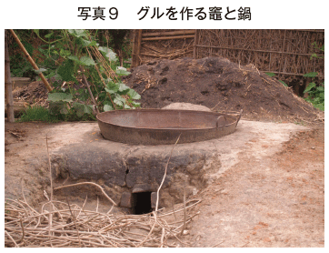 グルを作る生産農家を訪ねると、この辺りの竈は、円形の鍋一つ焚きだ(写真9)(写真10)。さとうきびのジュースを取り出すローラー式の圧搾機を動かすのに、牛の畜力を用いるというところもあった。必ずと言っていいほど、素焼きの壺に入ったジョラ・グル、ダナ・グルを自家用に保管してあった(写真11)。壺の口から手を入れると、脱色化された大きめの結晶が上部に詰まっている様子がわかる(写真12)。高さがある分、結晶部分が多いのではないかと思うが・・。この壺も、中のダナ・グルを取り出すには、壺を割るしかない。