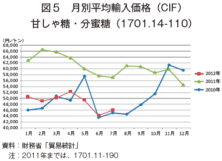 財務省「貿易統計」によると、2012年7月の甘しゃ糖・分蜜糖の輸入数量は、前年同月比△3.2%、4361トン減少の13万547トンであった。また、同月の輸入価格の平均は、前年同月比19.4%安、1万1119円下落のトン当たり4万6048円であった。