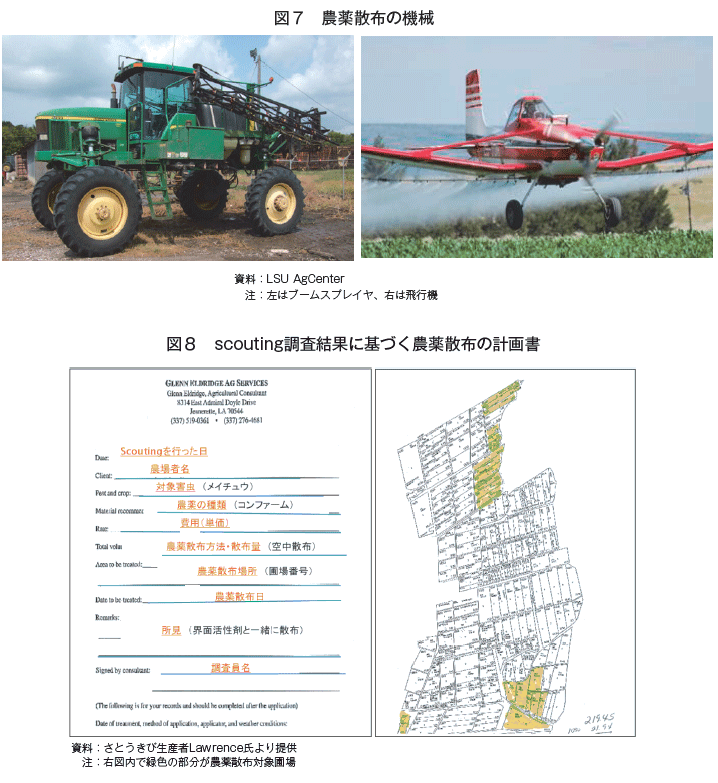 農業コンサルタントとの契約で行われるsugarcane borerの害虫防除方法は、scoutingというモニタリング調査結果を基づく農薬散布である。調査員は圃場ごとに決められたポイントでさとうきびに生息するsugarcane borerの数を調査する。そして、調査員は調査ポイント箇所に5%以上のsugarcane borer の生息が認められた圃場に対し農薬散布を行うよう図8のような計画書で生産者へ助言する。 この5%という数値は、sugarcane borerによるさとうきびへの被害が甚大なものにならない限界値として、LSUが長い時間をかけ試験を繰り返した結果、算出したものである。