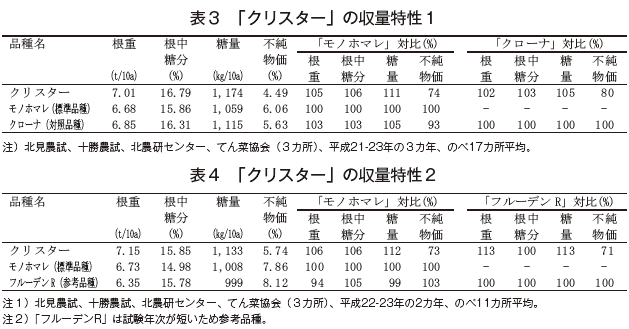 「クリスター」は根中糖分が「クローナ」より高く「フルーデンR」並であるにもかかわらず、そう根病抵抗性の他、褐斑病、黒根病の3病害に複合抵抗性を持ち、「クローナ」「フルーデンR」よりも糖量が多い。以上より「クローナ」および「フルーデンR」を「クリスター」に置き換えることで、てん菜の安定生産に寄与できると判断された。