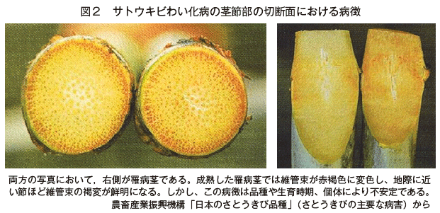 サトウキビわい化病の外観からの診断はきわめて難しい。肉眼検定の目安として茎節の断面の維管束の褐変化が挙げられるが、正確な判定は困難である。 (図2)