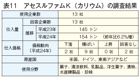 11社の平成24年の仕入量の合計は61トンで、前年比7.0パーセントの増加となった。前年に比べて増加とした企業は4社、前年並みとした企業は6社、減少とした企業は1社であった。主な増加の原因は、「低カロリー商品の増加に伴う使用量の増加」が挙げられた。