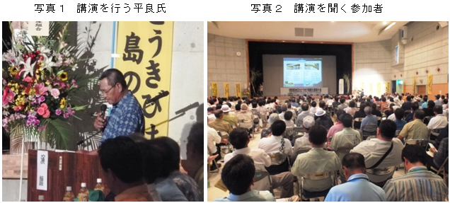 優良農家の事例発表では、伊良部島の生産者で、第42回日本農業賞を受賞した平良玄序氏により「さとうきび植付け前の土づくり及び肥培管理について」と題して講演が行われた。同氏は、高単収、高品質を維持するためには、土づくりや苗づくり、植付け後のかん水や施肥などの管理を徹底的に行うことが重要であると述べた。