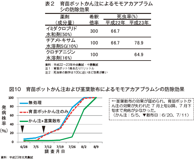 西部萎黄病は、アブラムシ(主としてモモアカアブラムシ)によって媒介されるウイルス病で、本病が発生すると根重・根中糖分が低下し、多発した場合には、健全株に対して糖量が約30パーセント減少する。病徴は感染から約20日で現れ、感染時期が早いほど被害が大きくなる。移植栽培では、移植直前の殺虫剤育苗ポットかん注が有効で防除の基本になり、茎葉散布による追加防除により発病が抑えられた事例がある(表2、図10)。