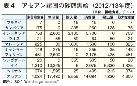 アセアン諸国の砂糖需給は表4のとおりであり、タイの輸出量が他の国に比べ圧倒的に多くなっている。同国の砂糖業界関係者によると、隣接国であるミャンマー、ラオス(カンボジアではサトウキビの生産はない)の砂糖生産コストは高く、価格面においても同国は優位性をもつとのことであった。