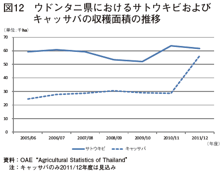 一方、サトウキビおよびキャッサバの両方の主生産地となっている東北部地域の一部では、サトウキビ価格とキャッサバ価格の変動が、毎年の作付面積の変動に強く影響している。今回調査で訪れた、同地域のウドンタニ県農業事務所の話では、株出し回数は0〜1回と少なく(同地域の他県では、株出しによりサトウキビの単収が半減するため、株出しを行わない場合もある。)、キャッサバの単収を1ライ当たり4トン(25トン/ha)とした場合、キャッサバ価格:サトウキビ価格=3:8よりもキャッサバ価格が高くなれば、サトウキビからキャッサバへ作付転換が進むという。