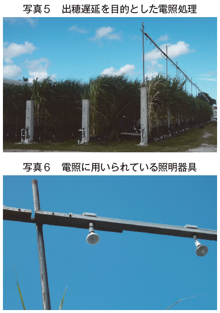 まず、自然条件下では早くに出穂するものを電照栽培で遅らせる処理である。前年の10月から温室内で苗を養成し、年が明けた4月に定植したポット栽培の交配素材を対象に、7月以降、夕方から日没後まで電照により補光するとのことであった(写真5,6)。サトウキビ属植物の出穂は日長時間の影響が強く、12時間30分の後に短日条件となることが基本的な要件である。理論的には、この日長変化を早めたり遅らせることにより、対象とする交配素材の出穂時期を調整することができる。理論に基づき、日長変化を自然条件よりも1カ月ほど遅らせる処理が行われてはいたが、訪問時で既に出穂している交配素材が見られたことから、必ずしもうまくはいっていないとの印象を受けた。沖縄県農業研究センターでも電照を用いた処理を行っており、サトウキビ研究所とは異なる処理内容によって、自然条件下で9〜10月に出穂するものを1カ月遅く出穂させることに成功している。その知見も踏まえ、カムストック博士とウェイン氏に以下のことなどを伝え、意見交換した。