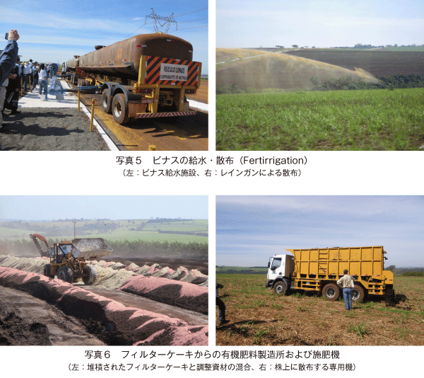 搾汁液や糖蜜からのバイオエタノールの製造過程で大量に発生する蒸留廃液(ビナス)の処理は、バイオ燃料の成否を左右する。宮古島で行われたバイオエタノール実証事業などでは、エタノール製造よりもむしろこの処理が課題となった。ビナスに含まれる有機系黒色物質が、地下ダムの水質汚染など深刻な環境問題を引き起こすのではとの懸念があった。一部の識者からは、ブラジルでも河川などの汚染が深刻化しているとの指摘があった。今回のISSCTでは、これに関する情報収集がポイントであった。驚いたことに、「Fertilizer(肥料)」と「Irrigation(かんがい)」を合わせた「Fertirrigation」すなわち「液肥かんがい」とでも訳せる造語が一般化していた。ビナスに限らず、洗缶水ほか工場より排出される廃水は、貴重な水資源および肥料として利用されている。前述のほ場見学ではレインガンを使用した散水デモを行っていた。環境問題を引き起こすのではないかとのわれわれの心配は何だったのかと思うほど、景気よく散布していた。また、移植プランタで植え付けた後、散水車でこのような水を大量に散水していた(写真14)。どこのほ場を見ても定置式のスプリンクラ施設はなく、散水車とレインガンの組み合わせが中心であった。前述のように、フィルターケーキは、広大な置き場で水分調整と成分調整を行った後、専用散布車で株上に施用していた。すなわち、製糖やエタノール製造過程で出る残渣(バイオマス)は余すところなく利用する高度な循環システムが構築されており、ブラジルの技術水準の高さがうかがえた。
