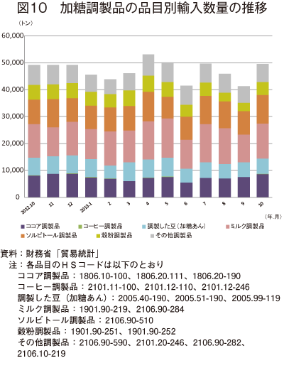 財務省「貿易統計」によると、2013年10月の加糖調製品の輸入量は、4万9563トン(前年同月比0.9%増、前月比20%増)であった(図10)。品目別の輸入量は、ミルク調製品が1万3035トン(前年同月比4.5%増、前月比27.1%増)と最も多く、次いで、ソルビトール調製品が1万711トン(前年同月比17.2%増、前月比23.2%増)、ココア調製品が8,648トン(前年同月比6.2%増、前月比14.4%増)となった。