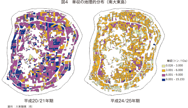 単収の地理的分布を図4で確認しよう。いわゆる幕内と言われるエリア内[海岸線から少し内側で島を一周する防風林(図4では白い筋で表されている)の内側]において、3カ所ほど両年ともに単収が高めになっている地区があるのだが、それはごく限られている。平成24/25年期は、特に度重なる台風の襲来による潮害によって、単収は低くなった。幕上(防風林の外の海岸沿いの)エリアは、単収の低いほ場が虫食い状に観察される。