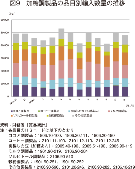 財務省「貿易統計」によると、2013年11月の加糖調製品の輸入量は、4万7849トン(前年同月比2.6%減、前月比3.5%減)であった(図9)。品目別の輸入量は、ミルク調製品が1万529トン(前年同月比3.5%減、前月比19.2%減)と最も多く、次いで、ソルビトール調製品が9,722トン(前年同月比7.2%減、前月比9.2%減)、ココア調製品が7,608トン(前年同月比13.1%減、前月比12%減)となった。