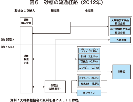 食品製造企業は砂糖企業から砂糖を直接購入することが多い一方で、外食産業は卸売業者から砂糖(15キログラム袋)を購入することが多い。また、一般消費者は、量販店などで購入するのが一般的である。量販店(大型ディスカウントストア、スーパー・スーパーマーケット(SSM))で販売される砂糖は、2012年で一般消費者向けの67%を占めるまでになっている(図6)。量販店については、これまで卸売業者を通じて砂糖を仕入れていたが、最近では大型ディスカウントストアや従来型よりも大規模なSSMなどが進出してきたことで、卸売業者を介さず、砂糖企業からの直販により購入するケースが増加している。
