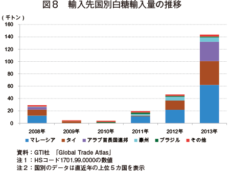 白糖の輸入について、2008年以降で見ると、2012年までは2〜4万トン台で推移していたが、2013年は前年の3倍となる14万4000トンに達した。国別は、マレーシアが6万2000トン(前年比185.8%増)、タイが3万9000トン(同159.5%増)、アラブ首長国連邦が3万1000トン(同531倍)と主要相手国が軒並み増加している(図8)。