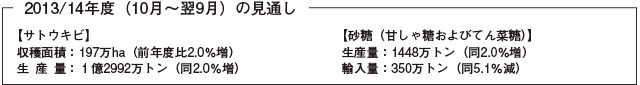 2013/14砂糖年度の砂糖生産量は前年度比やや減少するも輸出量は同水準を維持