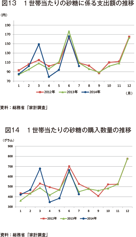 総務省「家計調査」によると、2014年7月の1世帯当たりの砂糖に係る支出金額は、102円(前年同月比6.4%安、前月比38.6%安)となった(図13)。また、同月の1世帯当たりの砂糖の購入数量は、425グラム(同5.6%減、同35.9%減)となった(図14)。