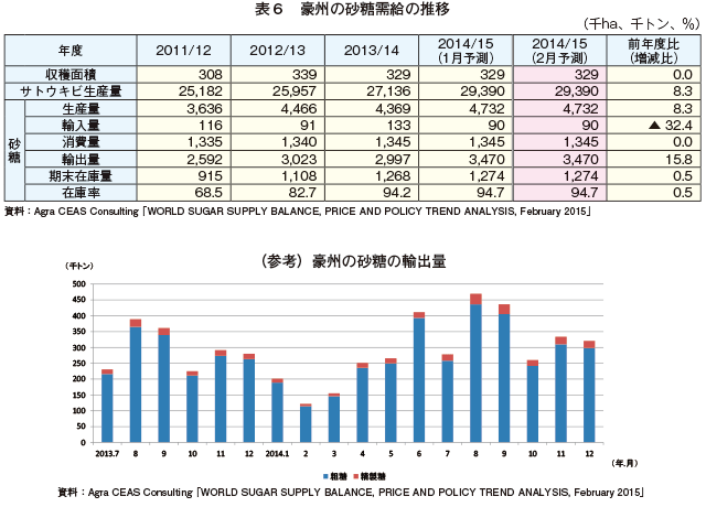 2014/15砂糖年度(7月〜翌6月)のサトウキビの収穫面積は前年度並みの33万ヘクタール、サトウキビの生産量は、主要生産地域であるクイーンズランド州北部が天候に恵まれ、単収が1ヘクタール当たり89.3トン(前年度比8.3%増)と向上することから2940万トン(同8.3%増)、甘しゃ糖の生産量は473万トン(同8.3%増)と前年度に比べかなり増加する見込みである(表6)。また、砂糖の輸出量は増産に伴い347万トン(同15.8%増)と前年度に比べ大幅に増加する見込みである。