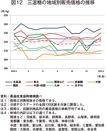 グラニュー糖の販売価格を地域別に見ると、中部(前月比3.3円高)で前月から上昇した。一方、北海道(同0.8円安)、関西(同0.5円安)、九州(同1.1円安)で前月から下落した。その他の地域では前月と同水準で推移した(図11)。最も安かったのは北海道の184.7円で、最も高かった関東などの240.6円(前月同)と比較すると、55.9円の価格差があった。