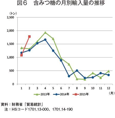 財務省「貿易統計」によると、2015年2月の含みつ糖の輸入量は、1780トン(前年同月比40.5%増、前月比64.5%増)となった(図6)。輸入先国はタイ、中国、ボリビア、フィリピンの4カ国であった。