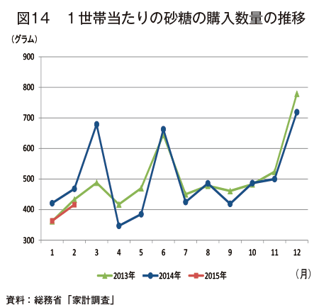 総務省「家計調査」によると、2015年2月の1世帯当たりの砂糖に係る支出金額は、95円(前年同月比6.9%安、前月比13.1%高)となった(図13)。また、同月の1世帯当たりの砂糖の購入数量は、416グラム(同11.1%減、同14.6%増)となった(