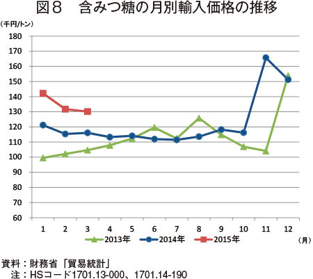 総務省「家計調査」によると、2015年3月の1世帯当たりの砂糖に係る支出金額は、103円(前年同月比30.9%安、前月比8.4%高)となった(