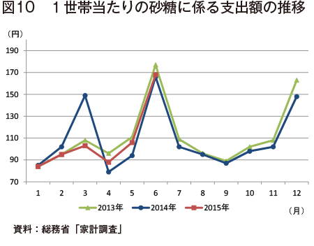 図10)。また、同月の1世帯当たりの砂糖の購入数量は、603グラム(同9.0%減、同38.3%増)となった(