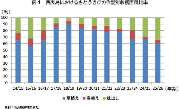 図4)。病害虫や台風被害を受けにくい夏植えが多かったが、近年では、ベイト剤などの利用による病害虫の防除ができるようになり、株が立つようになった。その結果、台風に強い株づくりが可能となったことから、株出しの比率が上昇している。