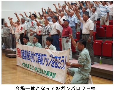 最後に、あまみ農業共同組合大島事業本部の柳東洋男統括理事の発声により参加者全員でガンバロウ三唱を行い、大会は閉会した。